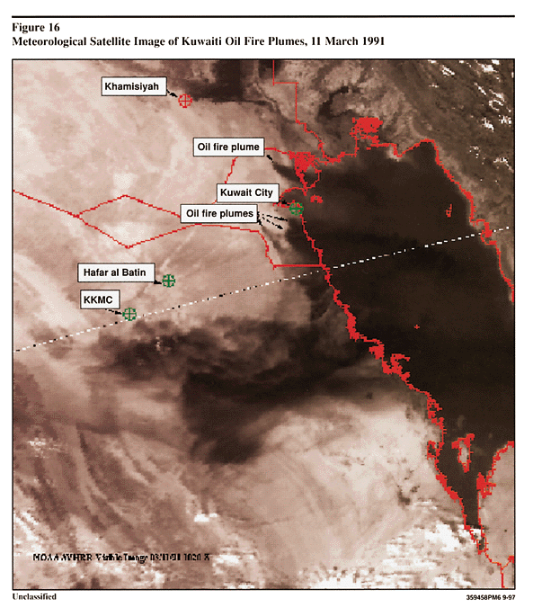 The Khamisiyah plume analysis is a retrospective analysis; hence, the opportunity for direct comparison with weather observations is limited. Several sources of imagery data, however, are available for the period 10-11 March 1991 which may provide qualitative comparison. During the May 1996 inspection of Khamisiyah, UNSCOM took GPS coordinates in the pit and recorded the location as 30� 44' 32'' N 46� 25' 52"E. An intense effort to find weather data for the area has netted good information on wind direction at the time of the explosion in March 1991. These include photography of the soot patterns created by the 10 March bunker explosions at Khamisiyah and regional-scale imagery of the Kuwaiti oilfield fire plumes.