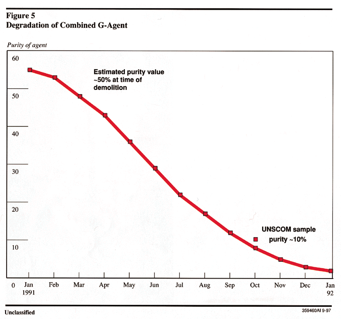 Our best estimate of the agent purity at the time of demolition is slightly less than 50 percent (see figure 5). Iraqi production records obtained by UNSCOM indicated that the sarin/cyclosarin (GB/GF) nerve agent produced and transported to Khamisiyah in early January 1991 was about 55 percent pure. (The tests documented in the records showed purity levels ranging from 45 to 70 percent, with 55 percent being the average from 1990 test dates.) The agent subsequently degraded to 10-percent purity by the time laboratory analysis had been completed on samples taken by UNSCOM from one of the rockets in October. On the basis of the sample purity and indications that the degradation rate for sarin and cyclosarin are similar, we assess that the ratio when the munitions were blown up in March 1991 was the same as that sampled in October 1991--3:1. Assuming a conservative, exponential degradation of the sarin/cyclo-sarin, the purity on the date of demolition two months after production can be calculated to be about 50 percent.