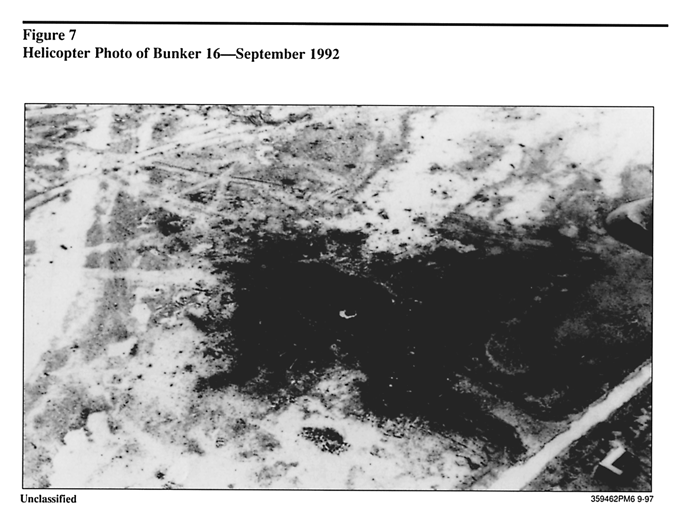 Using SPOT photography of 27 April 1991 (figure 6), analysts derived wind direction from distinct trails of windblown soot and ejecta from individual bunkers and corroborated their findings using UNSCOM helicopter color photos from October 1991 and September 1992 (figure 7). Using these sources, we have determined that the wind direction was 335° (from the north-northwest), thus initially blowing any chemical agent released from the pit to the south-southeast. The consistency of the azimuths within the 3.4-km spread of the bunker area destroyed allows us to reasonably translate the wind direction information to the pit area approximately 2 km from the bunkers. This wind direction is further corroborated by statements from one of the soldiers involved in the pit demolition, indicating that he was in a vehicle that drove through the smoke cloud in an area south to south-southeast of the pit. He reported no ill effects from the smoke.