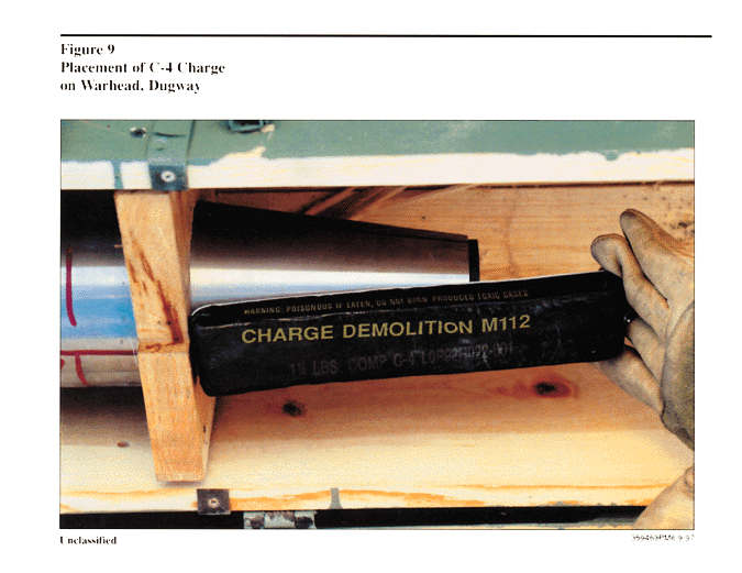 On the basis of these interviews, we assess the soldiers used about four boxes of US C-4 explosives, which would have provided 120 charges. All soldiers indicated that there were insufficient numbers of charges to completely destroy the rockets, even with the anticipated sympathetic detonation of what they thought were high-explosive warheads. They had to use Czech detonation cord to complete the demolition.