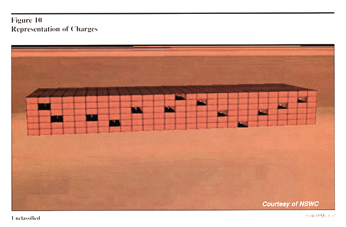 The Dugway testing provided a physical basis for estimating the effect of a charge on the surrounding rockets. We used pressure sensors to refine our gas dynamics models to approximate the threshold forces required to break a warhead. Gas dynamics modeling of the detonations and resultant pressure waves further bolstered our confidence that the results of the Dugway testing were realistic. This allowed development of a model to determine the effect of various placements of charges and orientations of rockets: