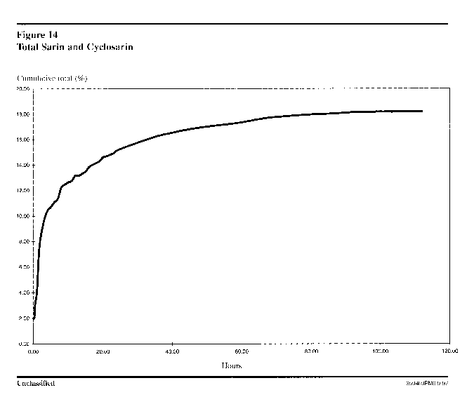 The plot in figure 14 presents the results of the Dugway laboratory tests, which provided the more conservative results of the two laboratories. Of particular interest, most of the chemical warfare agent evaporated during the first 10 hours. Thereafter, with a significantly decreased surface area from spillage, the release was slow, and significant portions of the agent stayed in the soil and wood. In addition, tests of the soil at Edgewood indicated that about one-eighth of the agent degraded in the soil in the first 21 hours.
