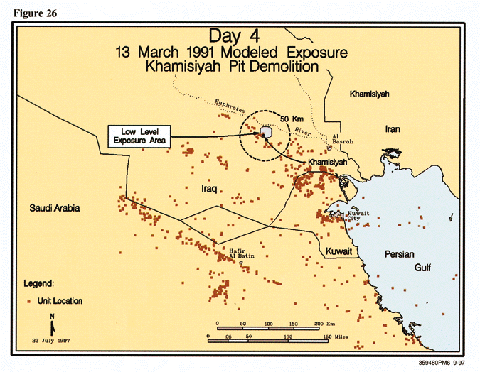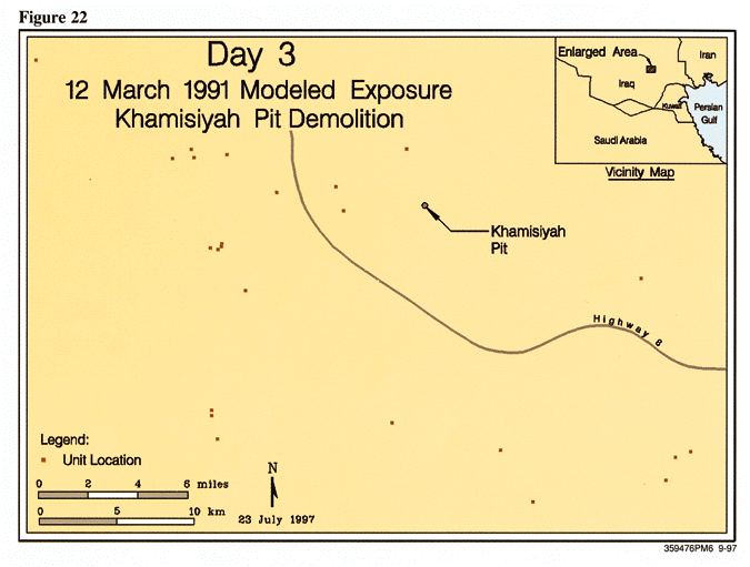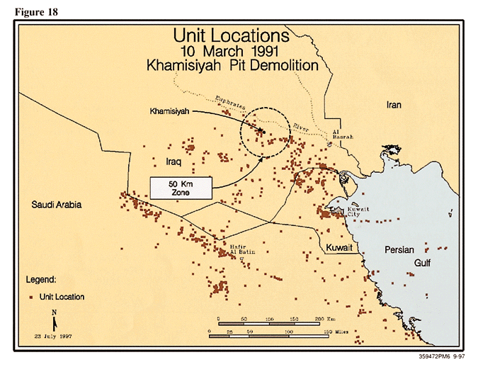 Figure 18 depicts the Kuwaiti Theater of Operations with last year's 50-km circle around Khamisiyah and DoD's current understanding of military unit locations. Each dot represents where company-size units were located based on DoD's S3-G3 conferences. These conferences helped develop much better fidelity on the locations of troops, allowing DoD to move from battalion-level accounting to company-level accounting. While that has been completed for all of XVIII Airborne Corps, it is not complete for the VII Corps. The S3-G3 conference for VII Corps is scheduled for September. The analysis that follows uses battalion-level data for the VII Corps; with more refined data the numbers are likely to be slightly lower.