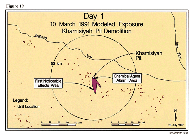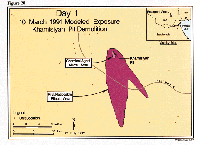The next map (figure 20) shows a closer view of the first-effects portion of the plume, which is about 20 km long and five km wide. No military units were located under the first-effects portion of the plume, which is consistent with the lack of reported effects and with DoD's survey results, which had over 99 percent of the respondents showing no signs of physical effects that could be correlated with exposure to sarin. The troops that performed the demolition had evacuated the area. As stated earlier, we know that one soldier involved in the demolition drove briefly through the smoke from the explosion. He had no ill health effects.