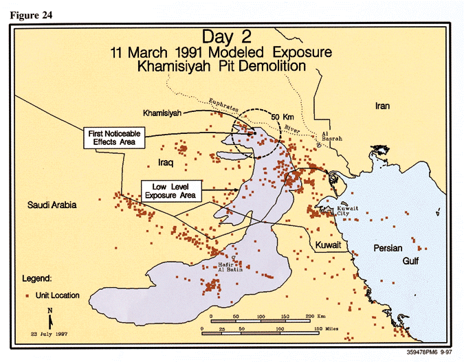 Figure 23 depicts the low-level exposure area, extending to the general population limit, for the first day. The wind has driven the chemical cloud south-southwest, extending almost 300 km and into Saudi Arabia. This potentially exposed almost 19,000 troops to low levels of chemical warfare agent. Remember that this plume is the composite of five models; the plumes from each individual model predicted smaller exposure areas. We used the composite approach to increase our confidence that the resulting plume would be our best estimate of the potential area covered, taking into account individual model biases. This approach was critical for notifications and for future epidemiological studies. However, we do not expect that everyone under the composite plume was exposed.