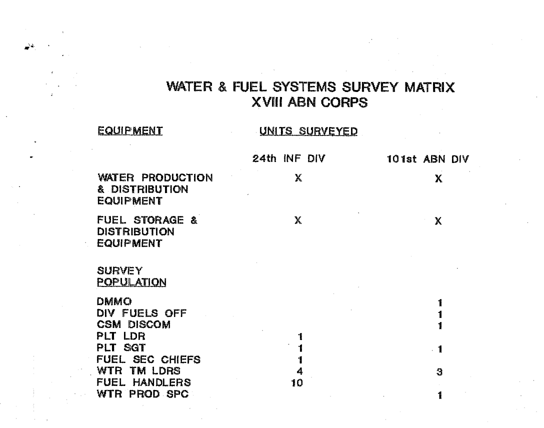 Subject = WATER AND FUEL SYSTEMS SURVEY MATRIX XVIII ABN CORPS