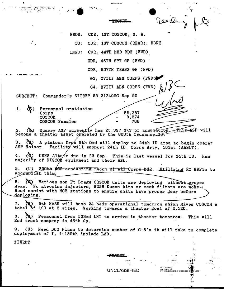 Document 1 f:/Week-18/BX000038/DUTY LOG 1 COSCOM SITREPS G3 SEP 90/commanders sitrep 53 212400c dr 1st coscom sep :06079615285225