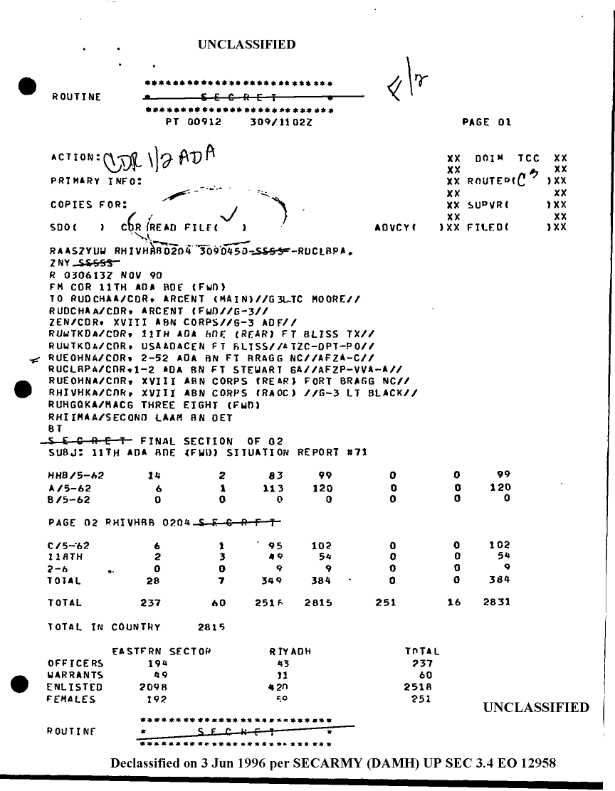 Document 3 f:/Week-19/BX001409/INCOMING G3 DESERT SHIELD MESSAGE NOV 1 OF 5/sitrep 11th ada bde 3 nov 90:06079615285230:0607961556256