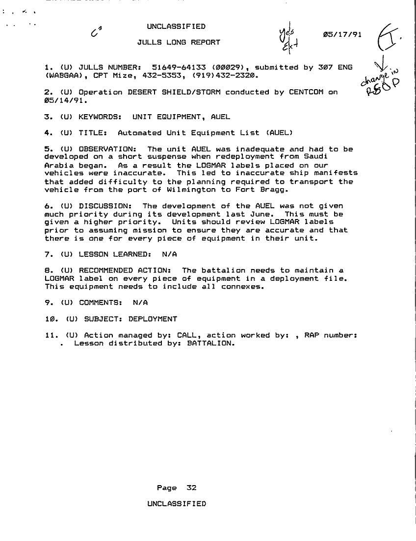 Folder Title = JULLS LONG REPORT 17 MAY 91 - 1