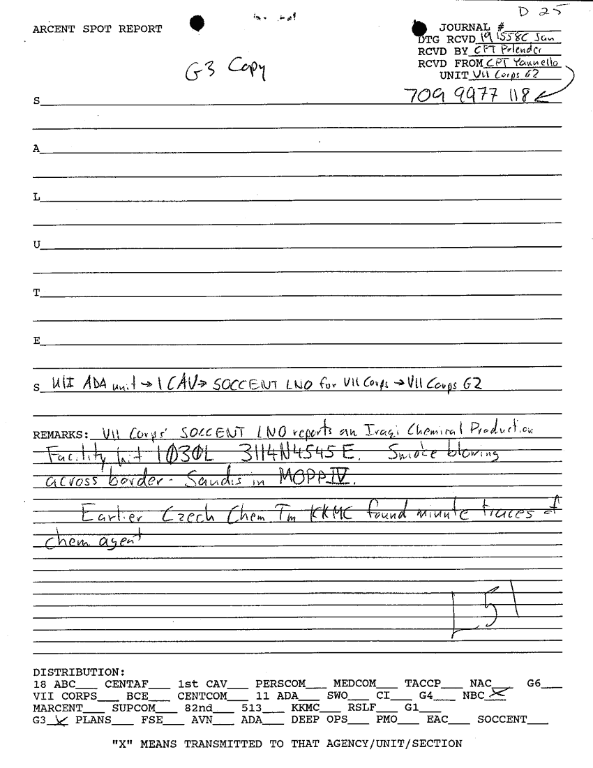 Document 1 f:/Week-30/BX000436/DAILY JOURNAL ARCENT 24 JAN 91/arcent spot report:08239614354514