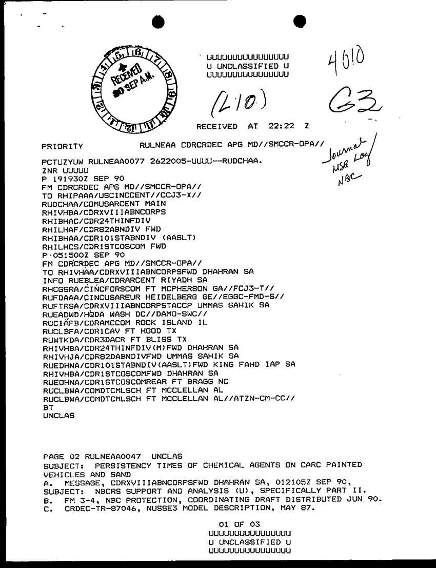 Document 3 f:/Week-28/BX000409/TACTICAL OPERATIONS CENTER LOGS - MSG FILE LOGS 19-20 SEP 90/presistency times of chem agent on carc painted :08239614362537