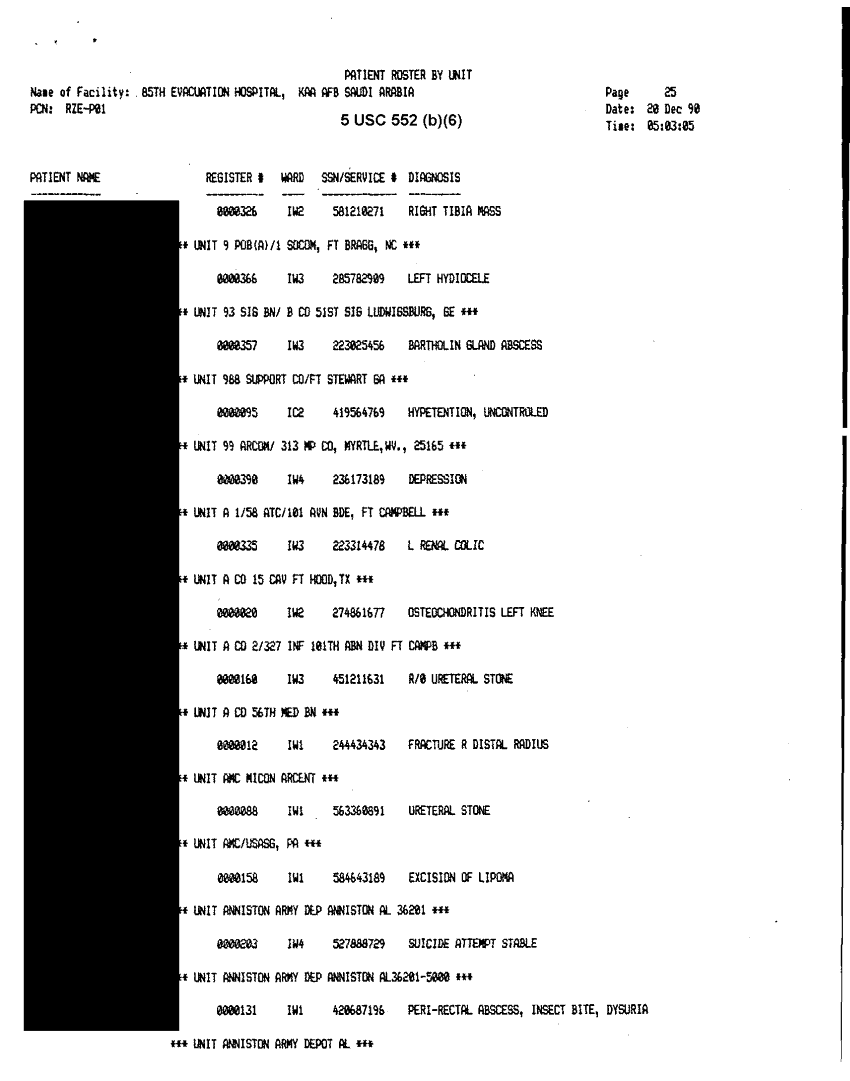 Document 30 f:/Week-32/BX000482/MEDSTAT - SITREPS DEC 90 2 OF 6/patient roster by unit 85th evac hospital 20 d:10119615412450