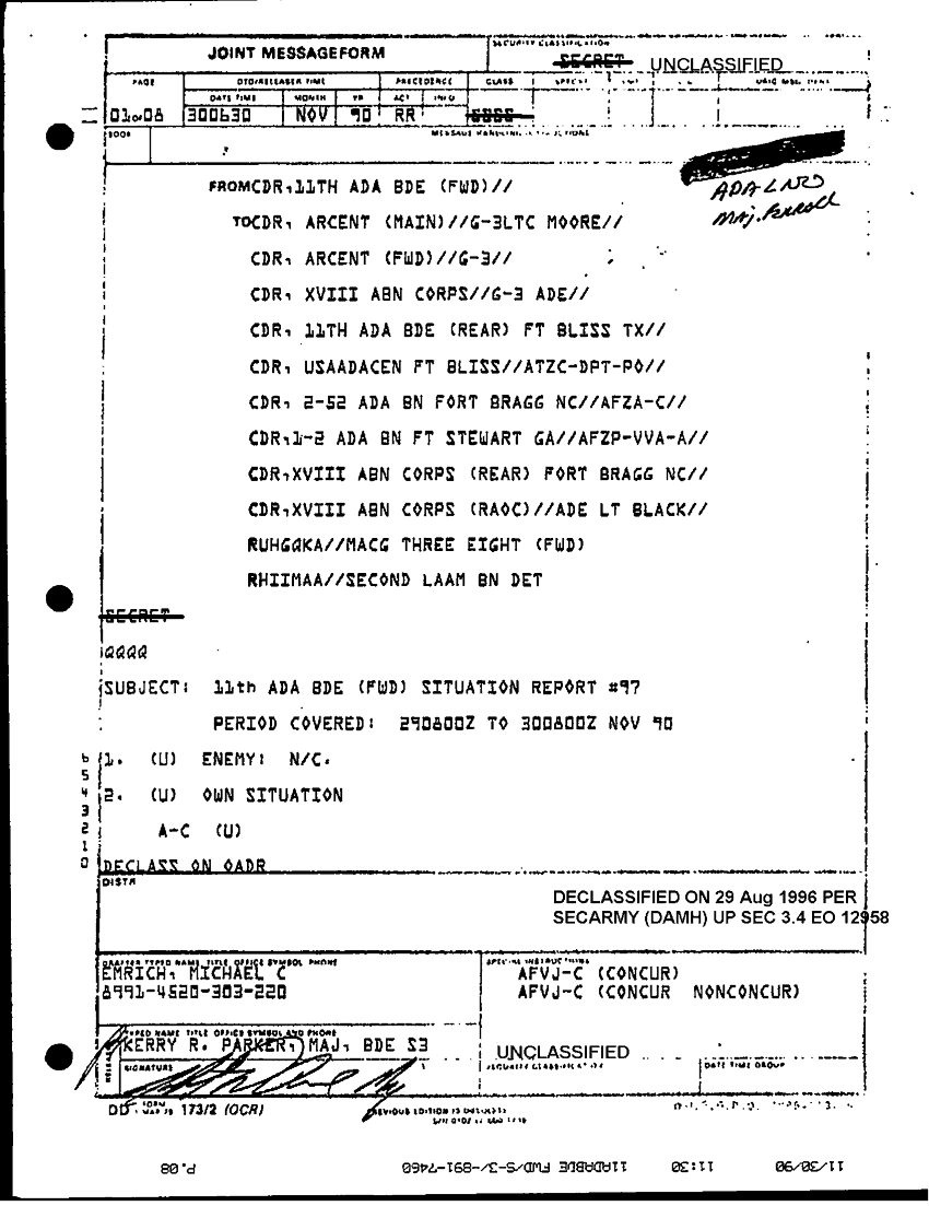 Document 8 f:/Week-32/BX000499/COMMAND REPORTS SITREPS 11TH ADA BDE 7 NOV - 7 DEC 90/11th ada bde situation report no 97 29 to 30 no:10119615413461