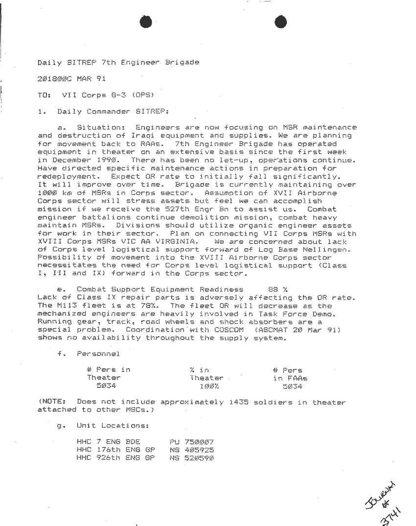 Document 87 f:/Week-24/BX000213/SITUATION REPORTS 7TH ENG BDE 22 DEC 90- 10 APR 91/daily commander sitrep:10019616504540