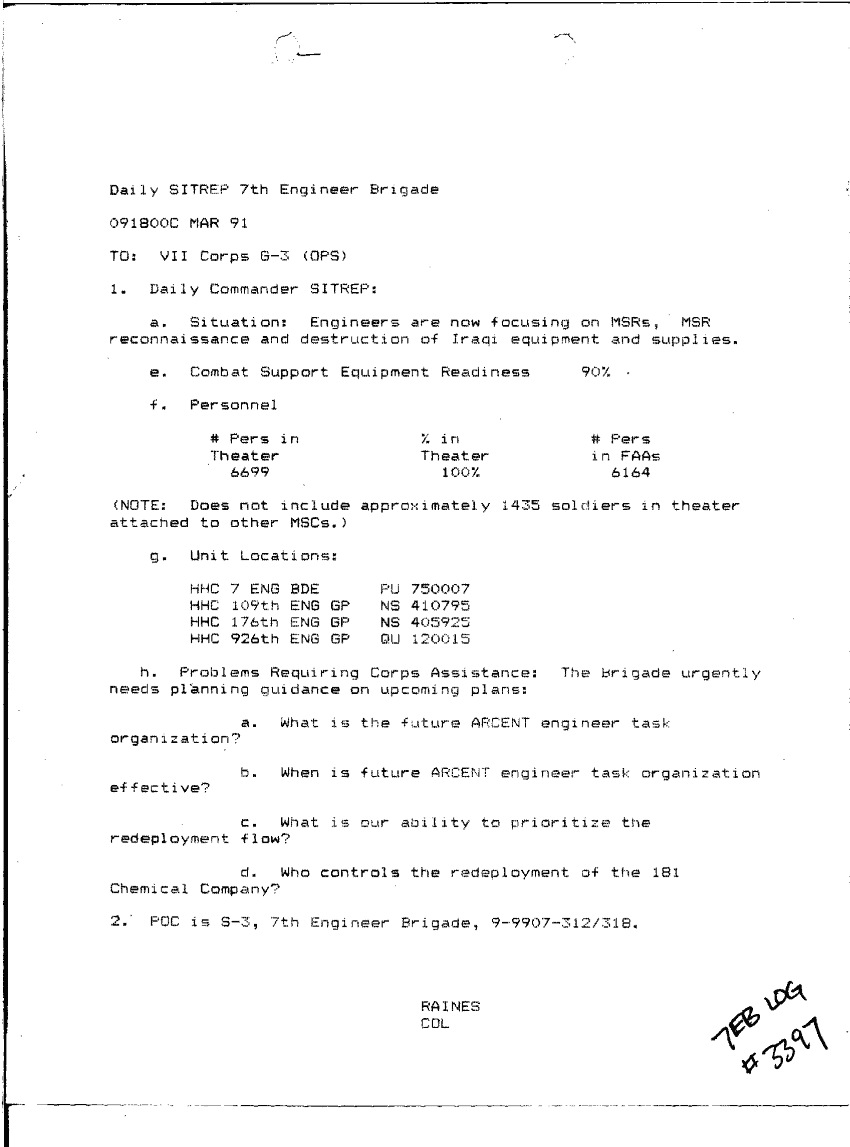 Document 87 f:/Week-24/BX000213/SITUATION REPORTS 7TH ENG BDE 22 DEC 90- 10 APR 91/daily commander sitrep:10019616504540