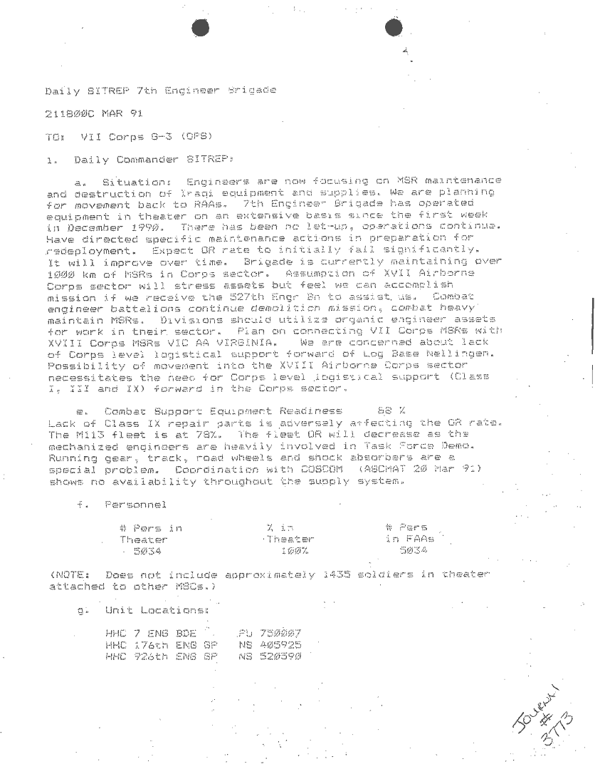 Document 87 f:/Week-24/BX000213/SITUATION REPORTS 7TH ENG BDE 22 DEC 90- 10 APR 91/daily commander sitrep:10019616504540