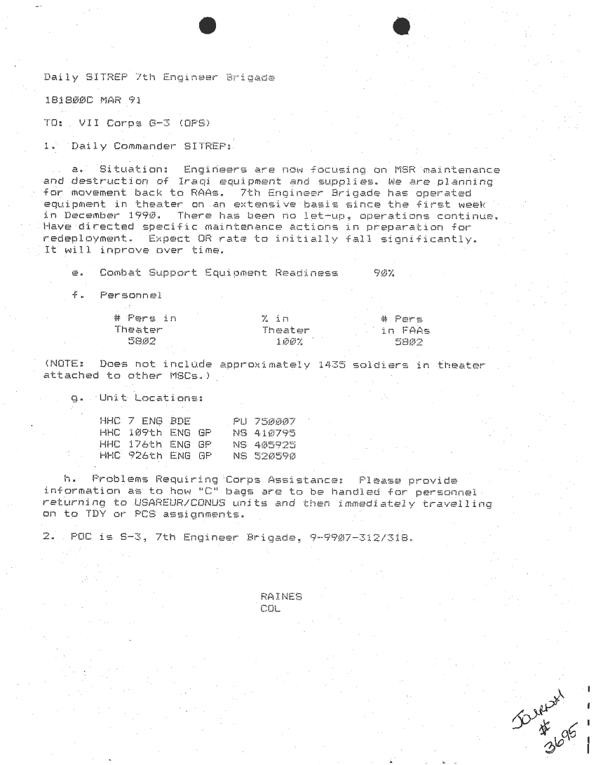 Document 87 f:/Week-24/BX000213/SITUATION REPORTS 7TH ENG BDE 22 DEC 90- 10 APR 91/daily commander sitrep:10259613090426