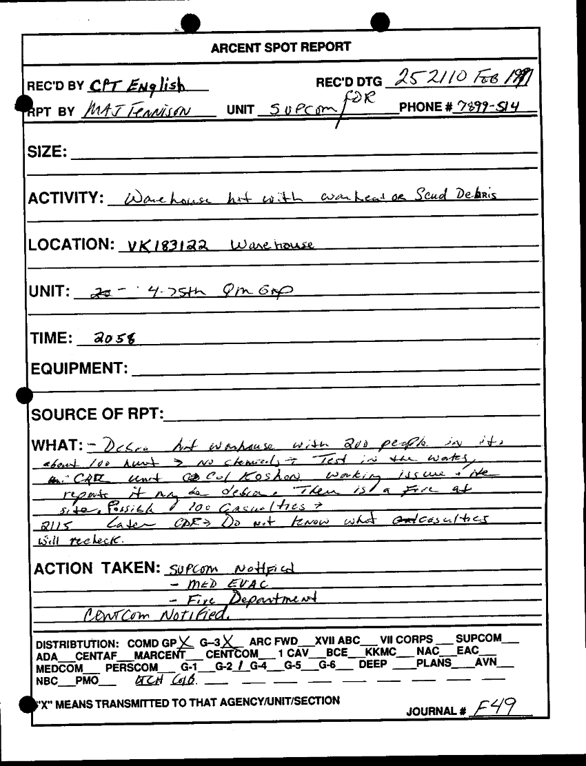 Document 1 f:/Week-29/BX000413/DAILY JOURNAL ARCENT 25 28 FEB 91/arcent spot report supcom 25 feb 91:12179611162697