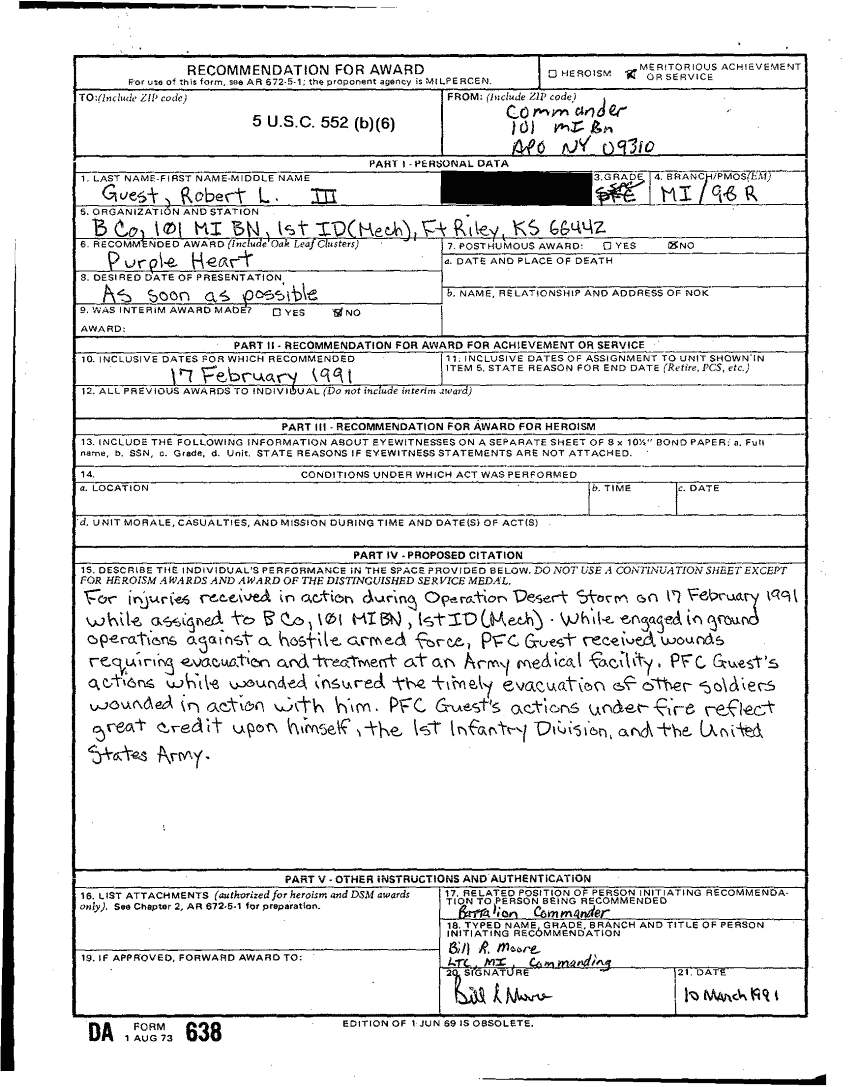 Document 78 f:/Week-26/BX001004/AWARD GUEST ROBERT L III-1/casualty report award of the purple heart:12179611151925