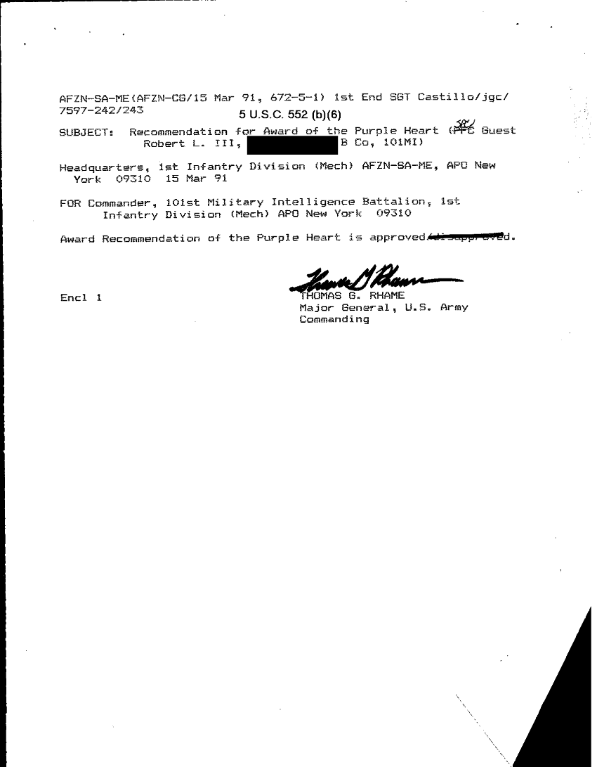 Document 78 f:/Week-26/BX001004/AWARD GUEST ROBERT L III-1/casualty report award of the purple heart:12179611151925