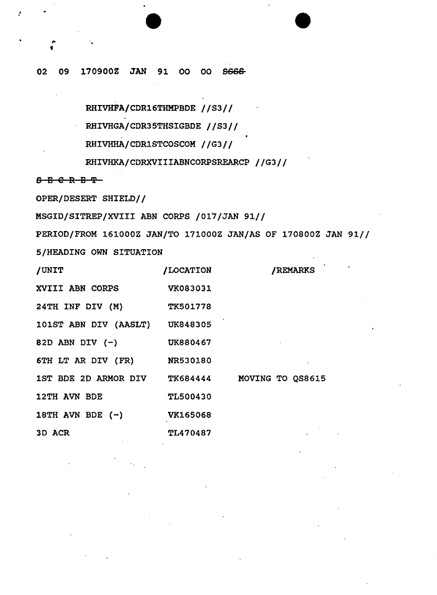 Document 9 f:/Week-10/BX000020/DUTY LOG G3 REAR XVIII ABC MAIN SITREPS CONT JAN 91/sitrep 17 jan 91:12179611154351