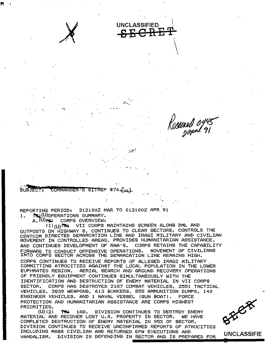 Document 6 f:/Week-43/BX000270/SUPPORTING DOCUMENTS FOR DAILY STAFF JOURNAL-2 APR 91-TACTICAL COMMAND POST/commanders sitrep nbr 74 312100z to 012100z apr :01029718423551