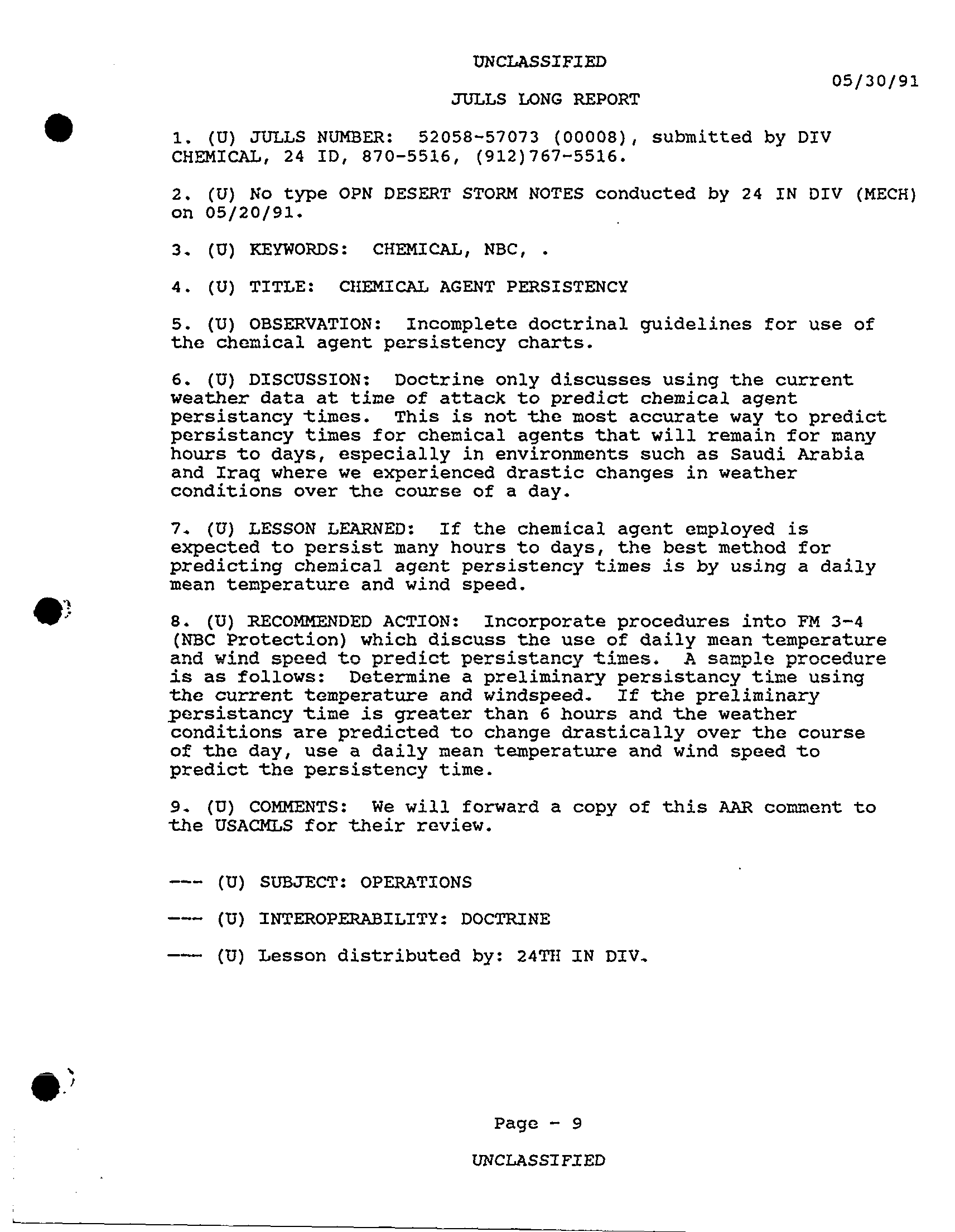 Subject = JULLS LONG REPORT 30 MAY 91