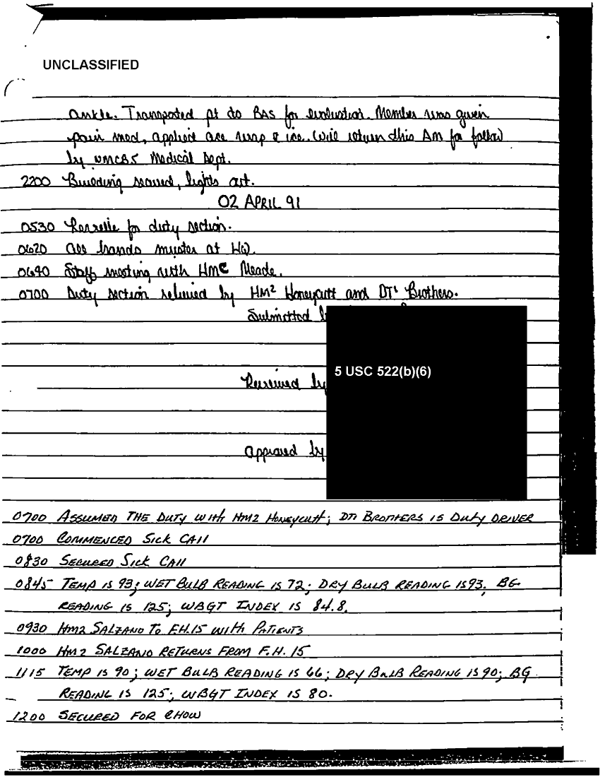 Document 49 f:/Week-37/BX303811/VARIOUS NAVAL MESSAGES FOLDER 4/various journal entries sick call 22 mar 91:0324971041562