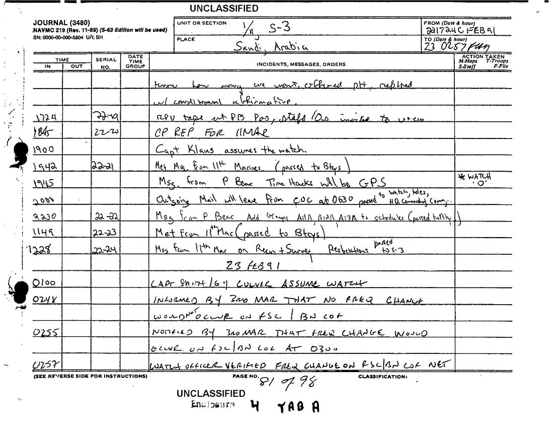 Folder Title = COMMAND CHRONOLOGY 1ST BATTALION 11TH MARINES JAN - FEB 1991