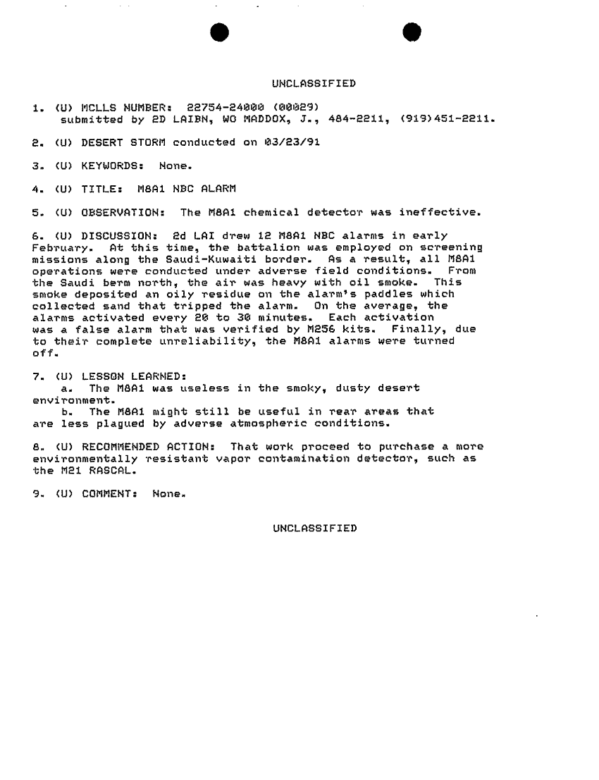 Document 1 f:/Week-42/BX600017/COMMAND CHRONOLOGY 2ND LIGHT ARMORED INFANTRY BATTALION JAN - MAR 1991/m8a1 nbc alarm 23mar91:1206961540047