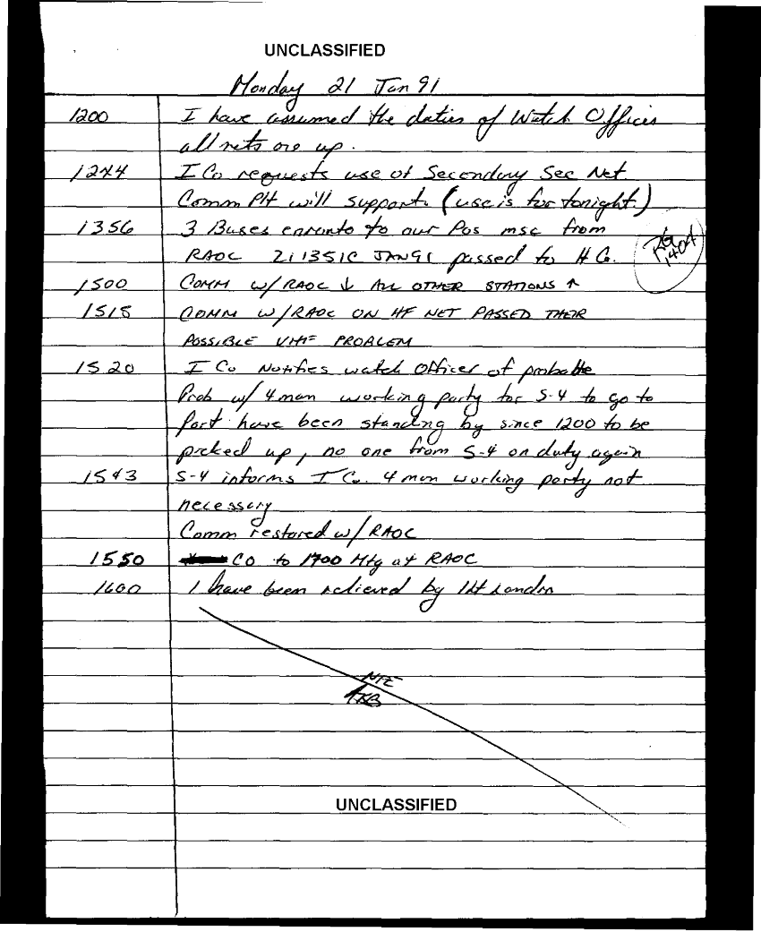 Document 103 f:/Week-35/BX600013/COMMAND CHRONOLOGY 3RD BATTALION 24TH MARINES JAN - MAR 1991 4 OF 4/handwritten log:0102970950272