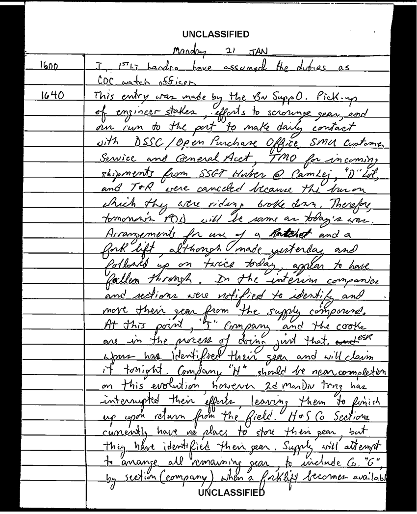 Document 103 f:/Week-35/BX600013/COMMAND CHRONOLOGY 3RD BATTALION 24TH MARINES JAN - MAR 1991 4 OF 4/handwritten log:0102970950272