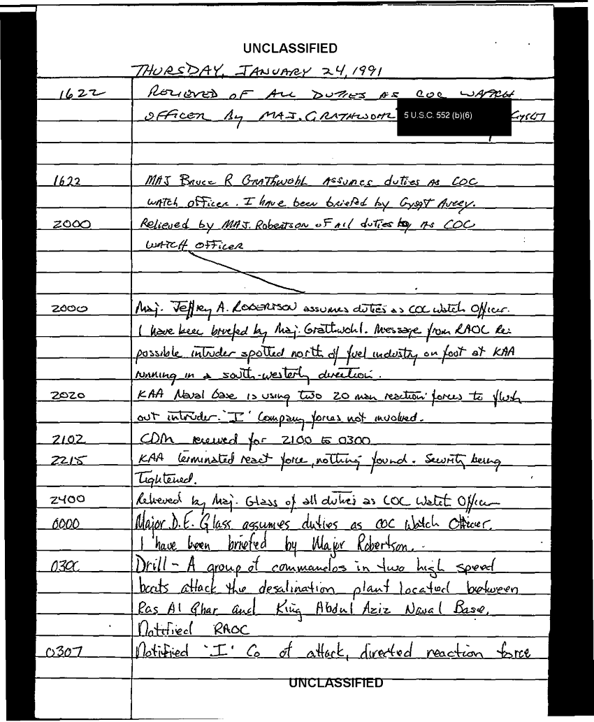 Document 103 f:/Week-35/BX600013/COMMAND CHRONOLOGY 3RD BATTALION 24TH MARINES JAN - MAR 1991 4 OF 4/handwritten log:0102970950272