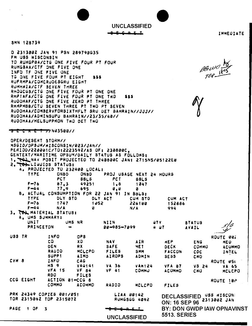Document 4 f:/Week-36/BX300047/FOLDER 4 MESSAGE FILES FOR 23 JAN 1991 CNA 2757 1OF2/opsum 023 uss wisconsin 23 jan 91:0925961702185