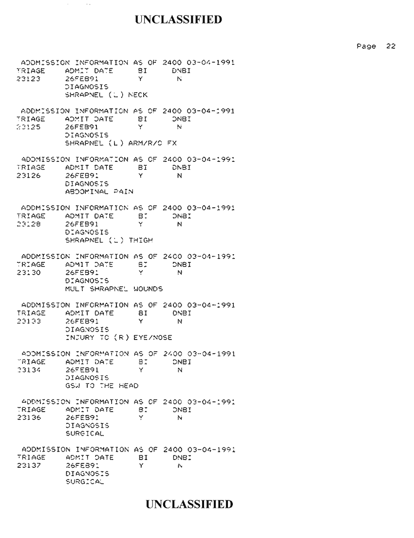 Document 34 f:/Week-42/BX300118/FOLDER 2 - PATIENTS TREATED - AL KHANJAR TRAUMA CENTER MAR 91/admission information as of 2400 03 04 1991:1112:1112961728162