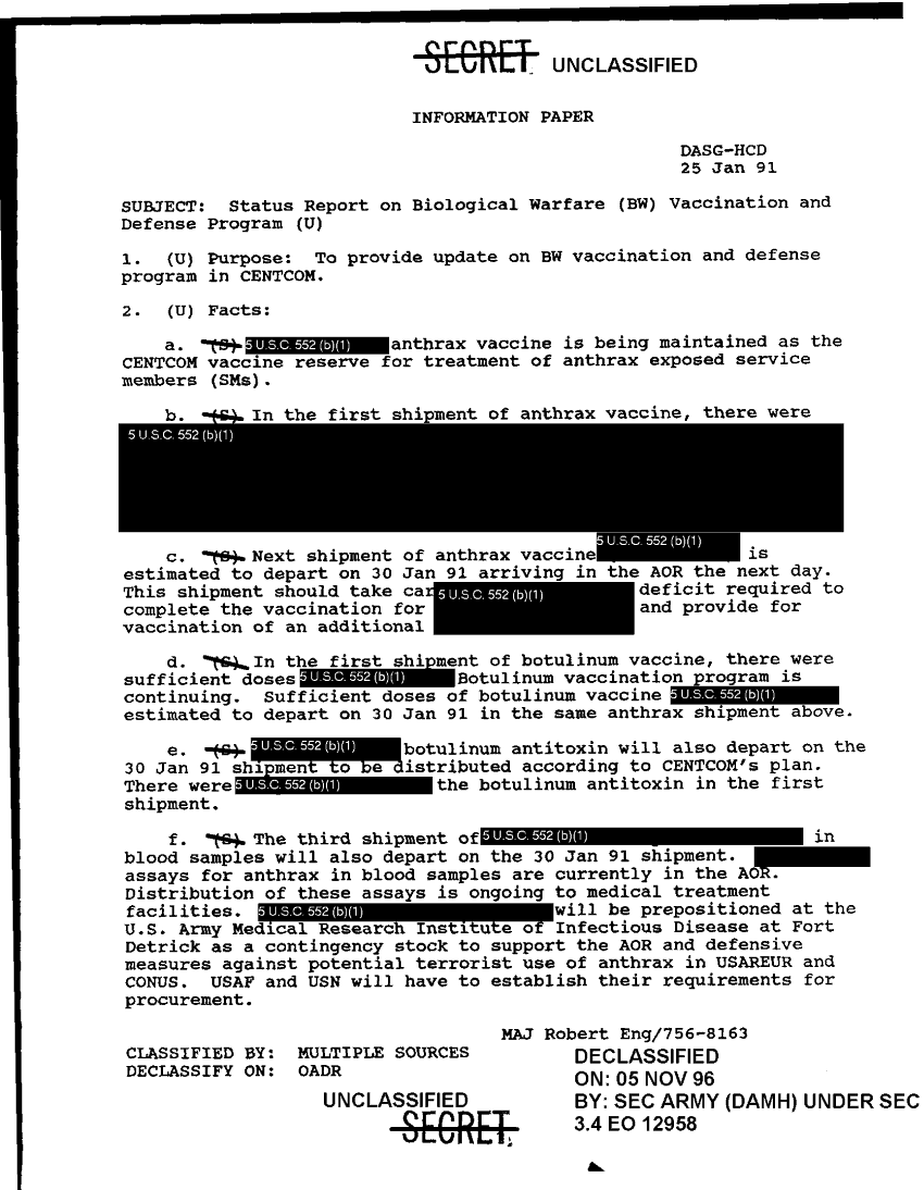 Subject = STATUS REPORT ON BIOLOGICAL WARFARE VACCINATION