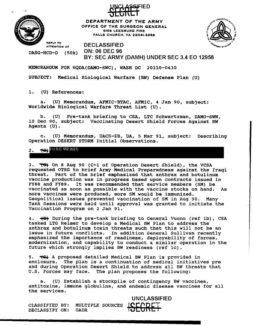 Subject = MEDICAL BIO WARFARE DEFENSE PLAN 18 MAR 91