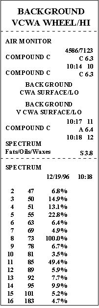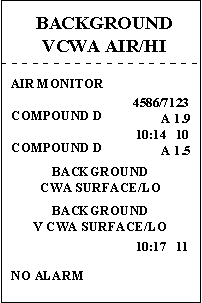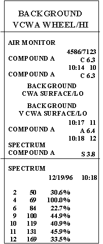 Following are four examples[26] of possible MM-1 tapes. Listed first on all four tapes is the word "background," which prints every time the MM-1 changes detection methods. Below "background" the detection method being used to monitor for chemical agents is printed (e.g. Wheel/Hi or Air/Hi). All four examples have Air Monitor printed on them. This is the mode of operation US troops were trained to use. The next item on the tapes is location information and is based on data provided by the crew at the start of a mission and updated throughout the mission. The compound initially detected and its relative intensity appear on the line below the location. The letter[27] preceding the relative intensity denotes the detection method being used.