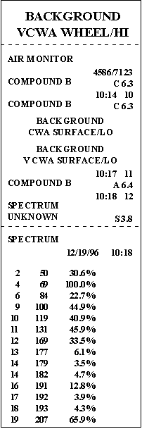 In the second example, the MM-1 initially alerts for compound B with a relative intensity of 6.3. The MM-1 operator switches to Surface/Lo and the MM-1 again alerts for compound B with a relative intensity of 6.4. A spectrum is run, but this time the spectrum does not match any of the compounds in the chemical library. The computer classifies the substance as "unknown" which means the chemical is not in the MM-1s library, and therefore is not compound B. If the substance is not in the library, the MM-1 has no basis of comparison, and thus can not determine if the substance is hazardous.