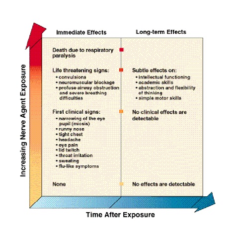 Immediate signs and symptoms of nerve agent poisoning. OP nerve agents are designed to incapacitate and kill humans. Inhalation exposure to these agents leads to immediate effects, including miosis, runny nose, and increased salivation. Immediate effects following skin exposure include local sweating and muscle twitching. Eye exposure rapidly produces miosis, which often is associated with eye pain, headache, and blurred vision.264 In fact, miosis is the most sensitive and specific immediate response to acute poisoning in humans, and this reaction has served as the basis for establishing allowable occupational concentrations for CW nerve agents. Higher doses of these agents cause more severe effects, including convulsions, neuromuscular blockage, profuse airway obstruction and apnea-developing within one to two minutes of exposure.77 Death occurs due to respiratory paralysis. The effects of nerve agent poisoning (figure 4-1) are virtually identical to those of severe OP-pesticide poisoning.