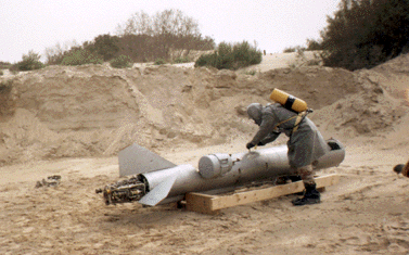 Figure 13. A US Air Force EOD specialist, wearing breathing apparatus, special protective apron, and gloves, disassembles an enemy missile