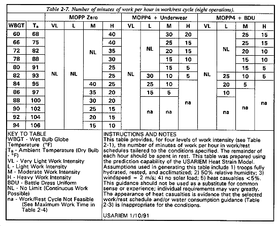 If the commander considers MOPP4 for the 3d platoon, a review of Table 2-2 indicates that a work/rest schedule is inappropriate (no work/rest cycle is recommended for heavy work in MOPP4 at a WBGT reading of 80�F), and Table 2-4 shows that continuous work of only 32 minutes would be possible before incurring an initial risk (5 percent) of heat casualties.