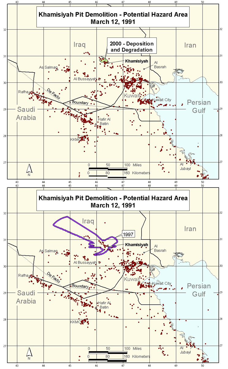 Figure 8. The combined General Population Limit contours predicted by all models for Day 3, March 12, 1991 Top: The 2000 results assuming dry gaseous deposition and agent decay; Bottom: the 1997 results