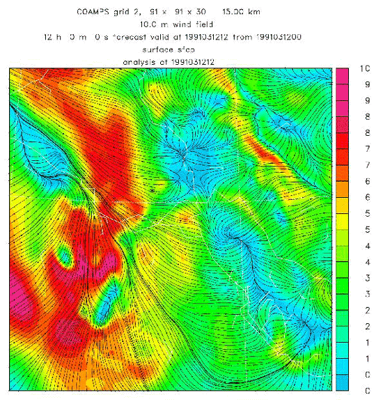 Figure A-48. COAMPS Grid 2 wind fields forecast for 1200 UTC, March 12, 1991
