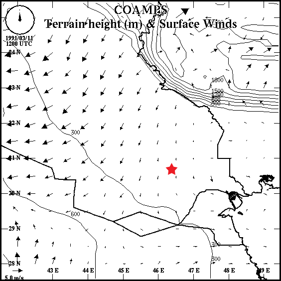 Figure A-65. 2000 COAMPS Grid 3 predicted wind fields for 1200 UTC March 11, 1991