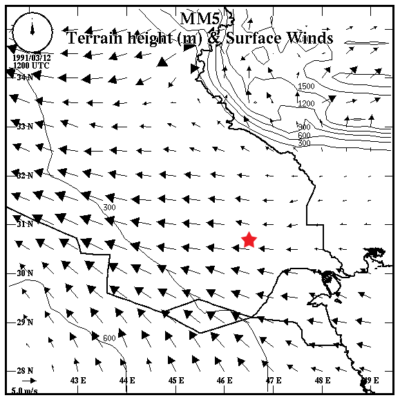 Figure A-67. 2000 MM5 Grid 3 predicted wind fields for 1200 UTC March 12, 1991