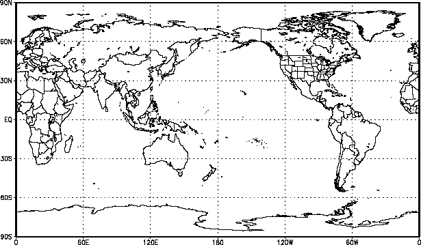 Figure A-7. Projection of globe with 30� x 60� grids Each 30° x 60° rectangle contains 288 computational cells for a 2.5° grid resolution.