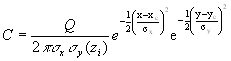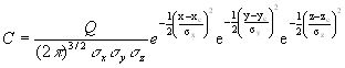 l. Model Output. HPAC/SCIPUFF describes the concentration field by summing contributions from each puff using the generalized Gaussian formula, (Equation A-15). Dosage calculations numerically integrate concentration with time and involve a summary updated at each time step.