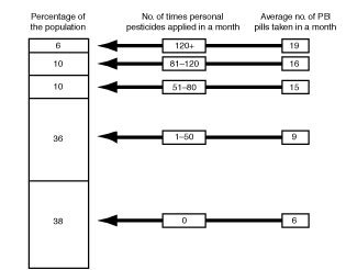 In these data, we find a statistically significant positive association between the number of PB pills taken in a month and the total number of applications of personal-use pesticides. In particular, frequency of use of personal-use sprays and lotions was found to be positively associated with of the number of PB pills taken, even after controlling for other important demographic effects.