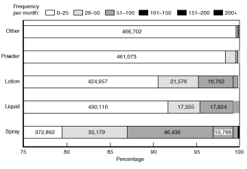 We previously mentioned animal flea or tick collars as a clear example of pesticide misuse. Other personal-use pesticides are more difficult to evaluate in these terms because there was little information allowing us to judge whether levels of use were inappropriate. Figure S.3 plots the distribution of the population with a particular frequency of use for each form of pesticide. It shows, for example, that about 3 percent of the population used sprays more than 100 times a month, or an average of more than three times a day. For a given individual, if the spray was permethrin, such a frequency of use is in excess of the recommended amount.[7] Similarly, about 5 percent of the population used liquids or lotions more than 100 times a month.